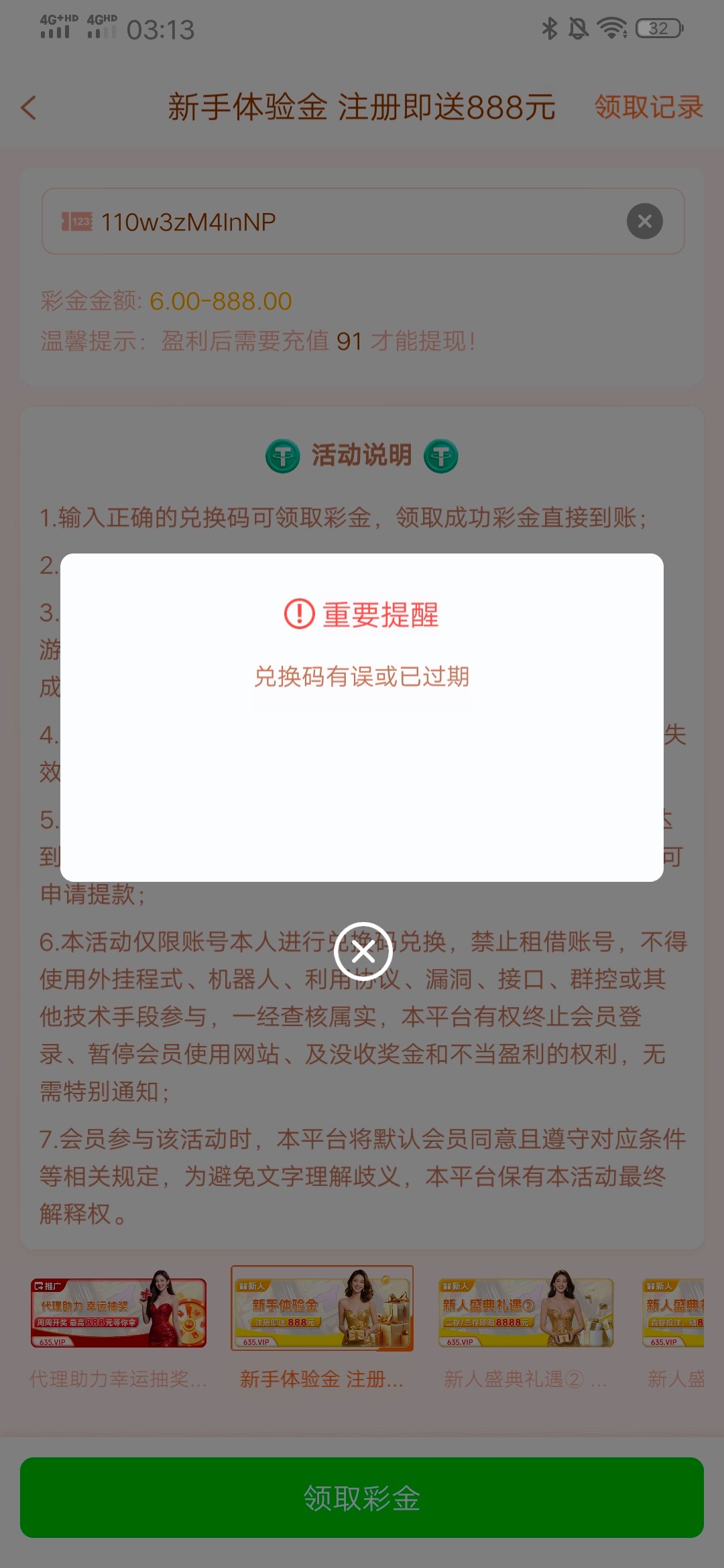 对换码失效或过期,哈哈。大家别去注册了