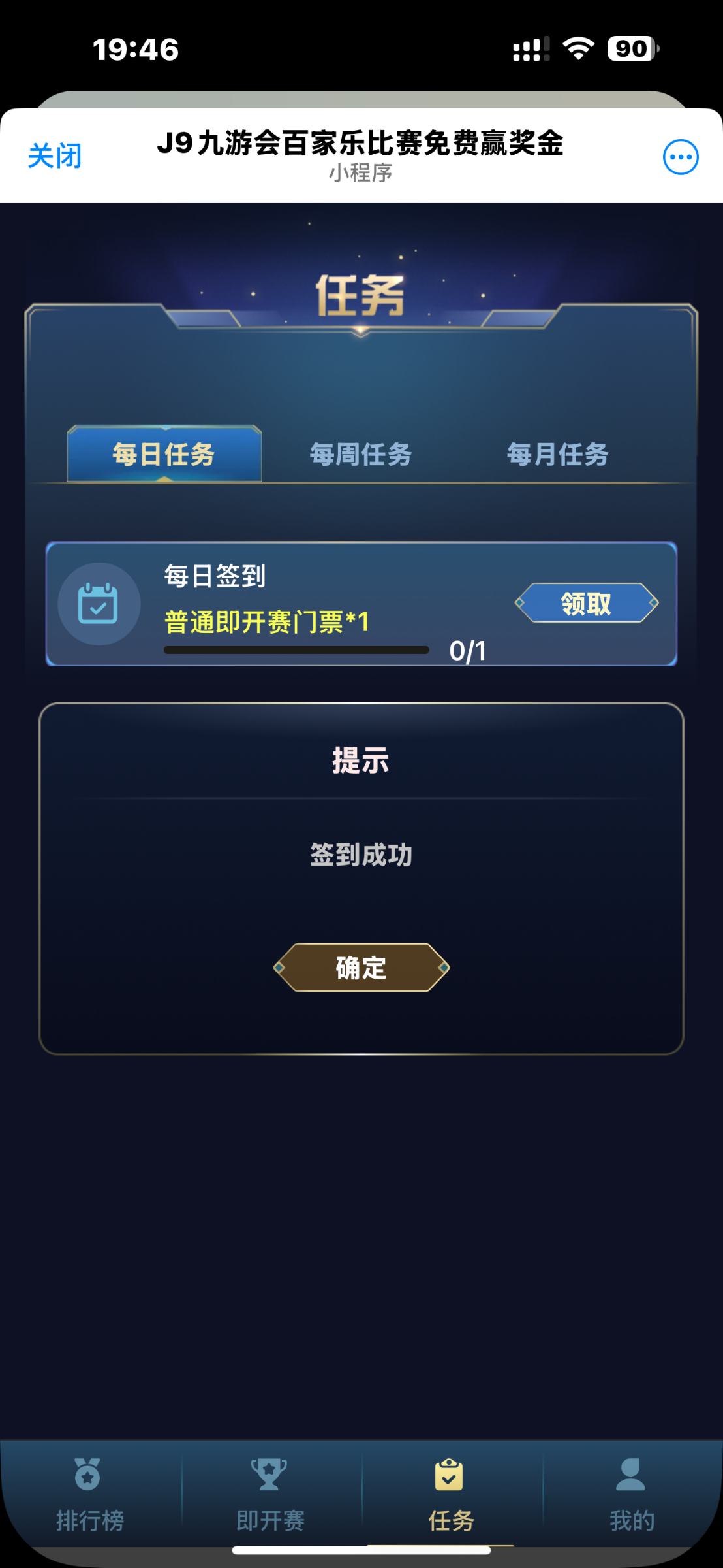J9九游会百家乐参赛流程:点击机器人发起聊天<立即参赛>进入应用后点击<任务><签到领取门票>获得门票后即可参赛,每人100万筹码,10局比赛赢得5局且赢得5万筹码即可获得奖金5U  【每日签到皆可获得门票】